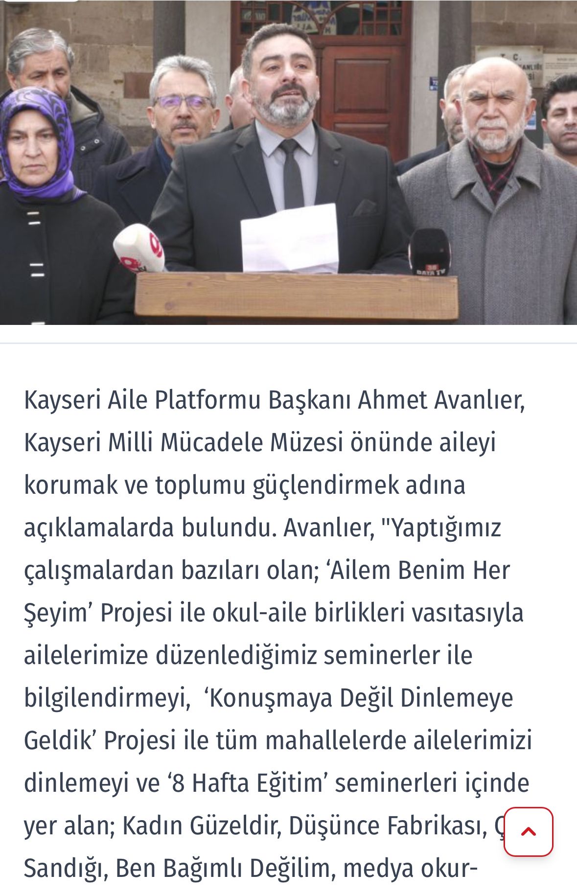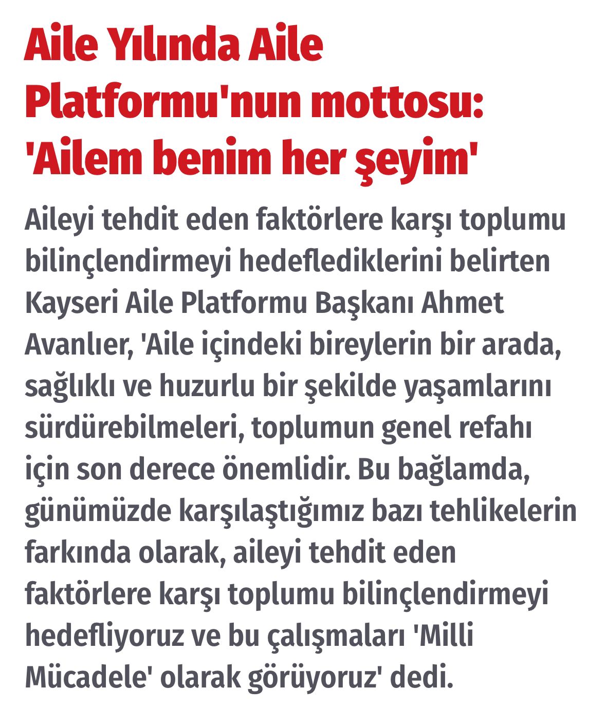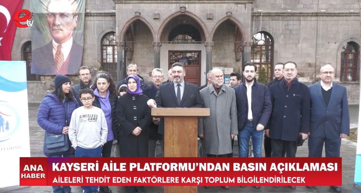Aile, toplumun en temel yapı taşıdır. Biz çok iyi biliyoruz ki ancak güçlü aile yapısına sahip toplumlar geleceğe güvenle bakarlar. Bu bilinçle Kayseri Aile Platformu olarak, ailenin korunması, güçlendirilmesi ve sağlıklı bir toplumun temellerinin atılması adına çeşitli çalışmalar yürütmekteyiz. Aile içindeki bireylerin bir arada, sağlıklı ve huzurlu bir şekilde yaşamlarını sürdürebilmeleri, unutulmuş değerlerimizin tekrar hatırlatılması, ailelerimizin ve gençlerimizin bilinçlenmesi, toplumun genel refahı için son derece önemlidir. Bu bağlamda, günümüzde karşılaştığımız bazı tehlikelerin farkında olarak, aileyi tehdit eden faktörlere karşı toplumu bilinçlendirmeyi hedefliyoruz ve bu çalışmaları “MİLLİ MÜCADELE” olarak görüyoruz. Bu sebeple de basın açıklamamızı Kayserimiz için Milli Mücadelenin timsali olarak gördüğümüz “Milli Mücadele” müzemizden yapıyoruz.